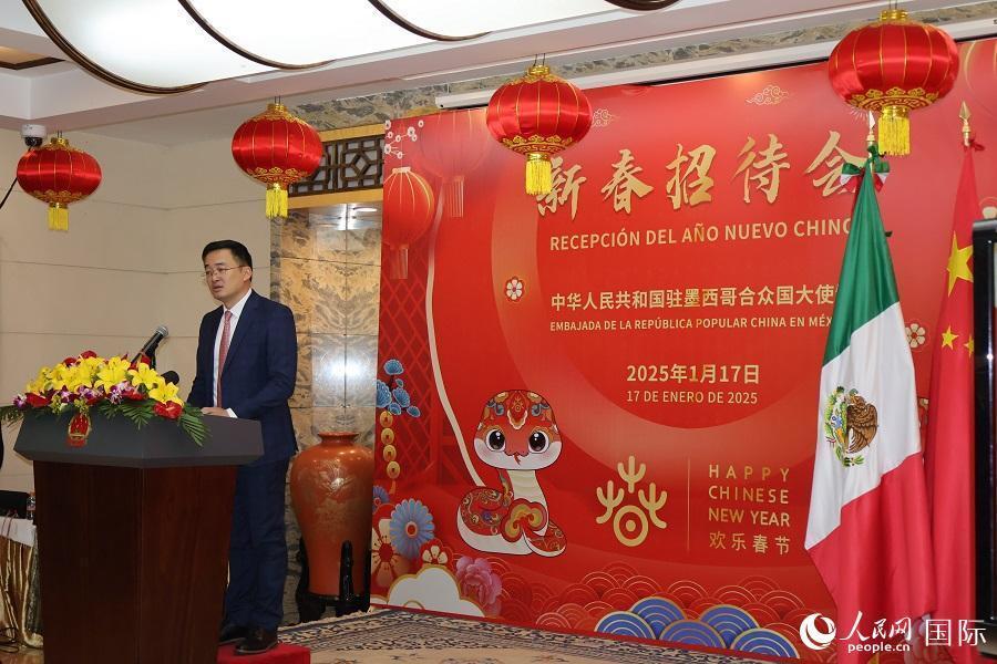 中国驻墨西哥使馆临时代办朱健致辞。埃内斯托·多明戈斯摄人民网墨西哥城1月19日电 (记者谢佳宁)1月17日,中国驻墨西哥大使馆张灯结彩、宾客满堂。使馆临时代办朱健公使在馆内举办“温暖迎春·共庆中国年”新春招待会。墨联邦参议院亚太外委会主席波列文斯基、外交部亚太司司长冈萨雷斯等当地政要和各界友人,以及旅墨华侨华人、中资机构、教师留学生代表等400多人出席。